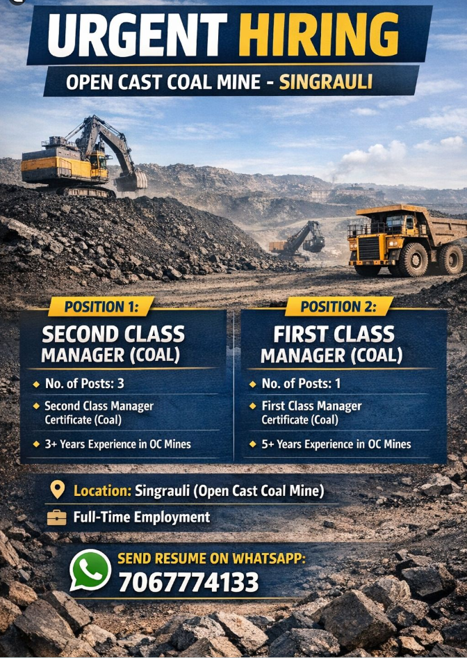 Description: Eligibility: Valid Second Class Manager Certificate (Coal) Minimum 3+ years experience in OC coal mines Interested candidates may share their resume on WhatsApp: 7067774133 Note: Only candidates with valid DGMS certificates and relevant OC coal mine experience will be considered.